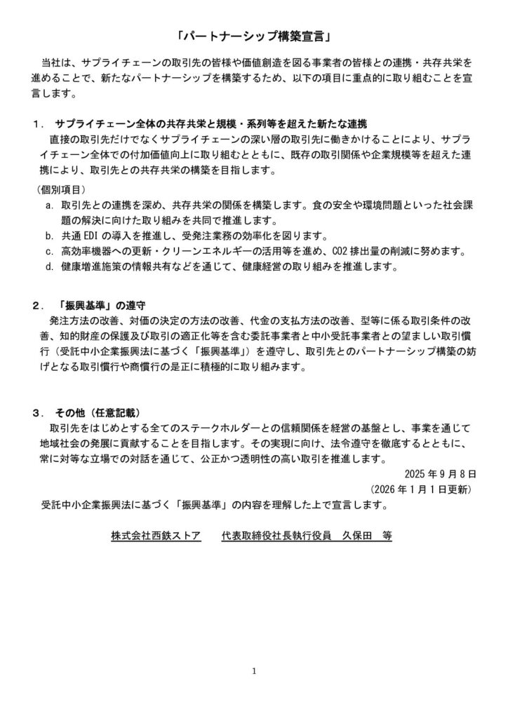 株式会社西鉄ストアは、サプライチェーンの取引先の皆様や価値創造を図る事業者の皆様との連携・共存共栄を進めるため、「パートナーシップ構築宣言」を策定・公表いたしました。