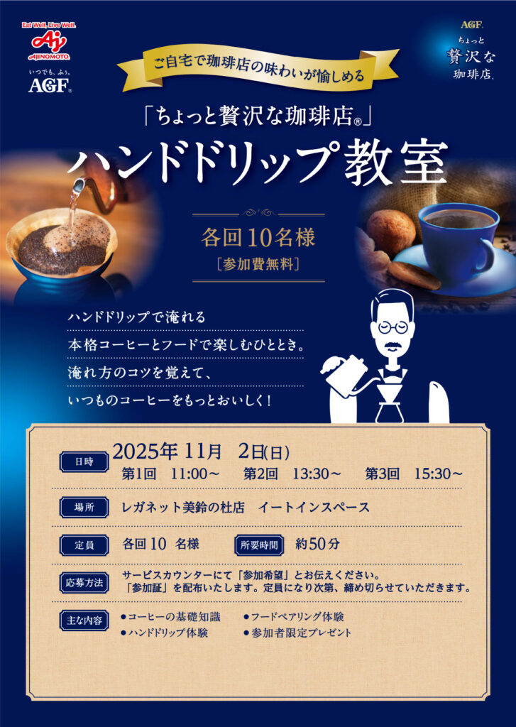 味の素AGFの商品「ちょっと贅沢な珈琲店Ⓡ」のハンドドリップ教室を「レガネット美鈴の杜」にて開催いたします。