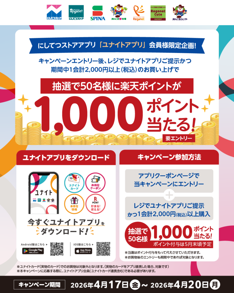 ②期間中、ユナイトアプリをレジにてご提示いただき2,000円(税込)以上購入