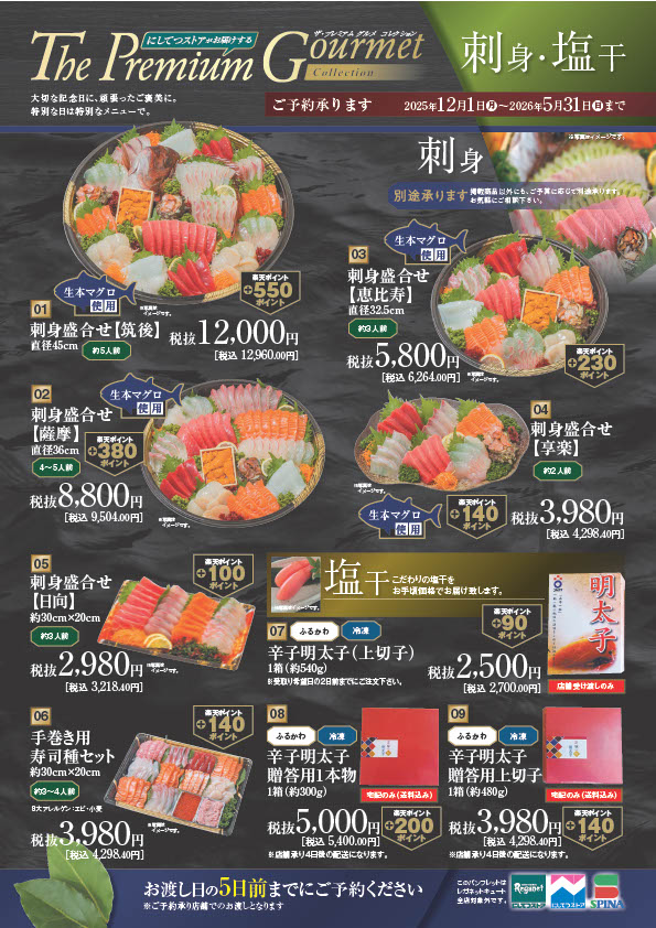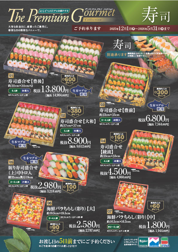 ※寿司・刺身については、レガネット(中間・天神・砂津・東郷)は取り扱いがございません。