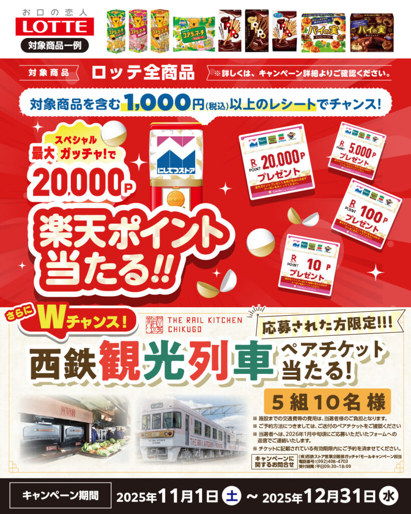 11月1日より、ロッテ×西鉄ストア共同企画 ガッチャ!で「レールキッチンチクゴチケットや楽天ポイントが当たる!キャンペーン」を開催します!!