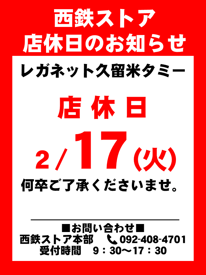 店休日のお知らせ/2月17日(レガネット久留米タミー)