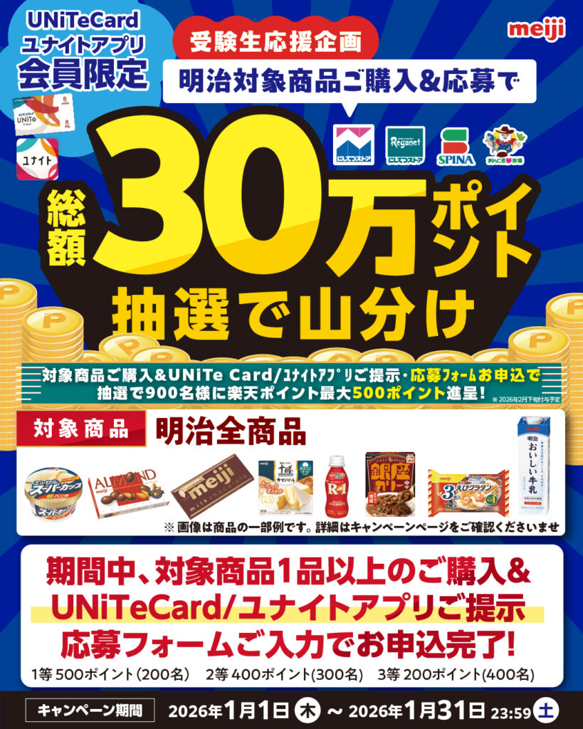 ②対象期間中(1/1~1/31)にレジでUNiTeCardまたはユナイトアプリをご提示の上、キャンペーン実施店舗で対象商品1品以上をご購入