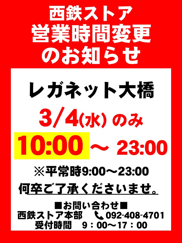 開店時間変更のお知らせ/3月4日(水)(レガネット大橋)