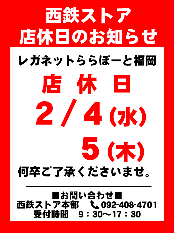 店休日のお知らせ/2月4日5日(レガネットららぽーと福岡)