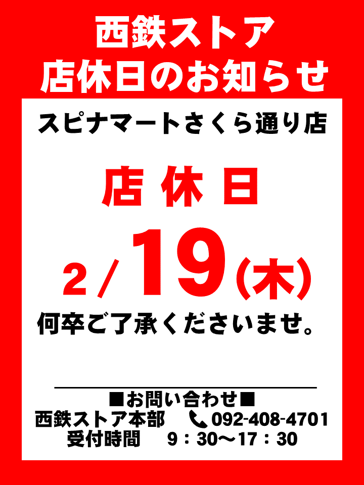 店休日のお知らせ/2月19日(スピナマートさくら通り店)