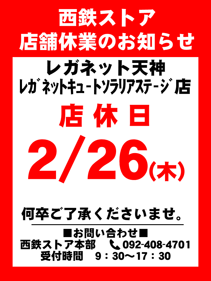 店休日のお知らせ/2月26日(天神店、キュートソラリアステージ店)